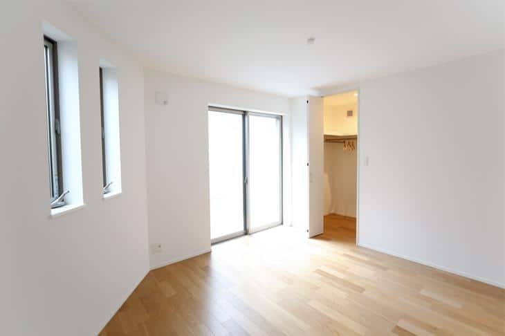 1階にある主寝室は、7.08畳の明るく、広々とした空間。掃き出し窓の向こうには中庭が広がっています。変形の土地を活かした部屋の形状も、シンプルになりがちな居室のアクセントに。たっぷり収納できるWICも備え付けています。