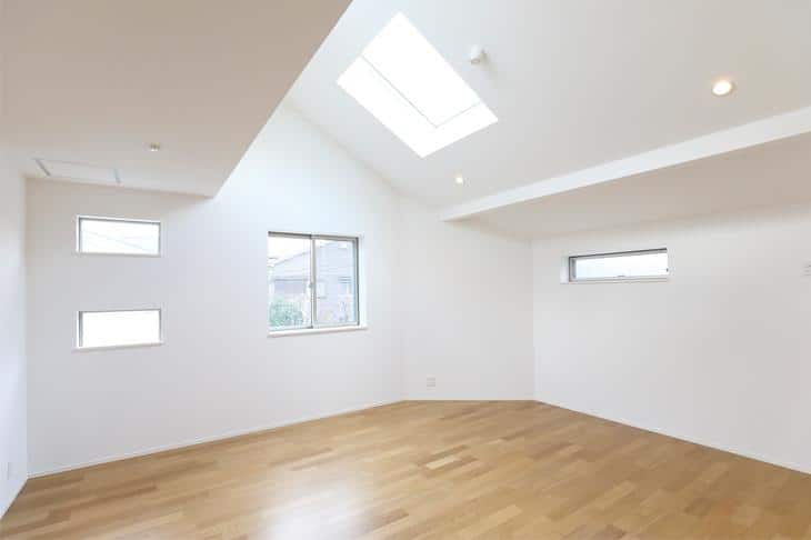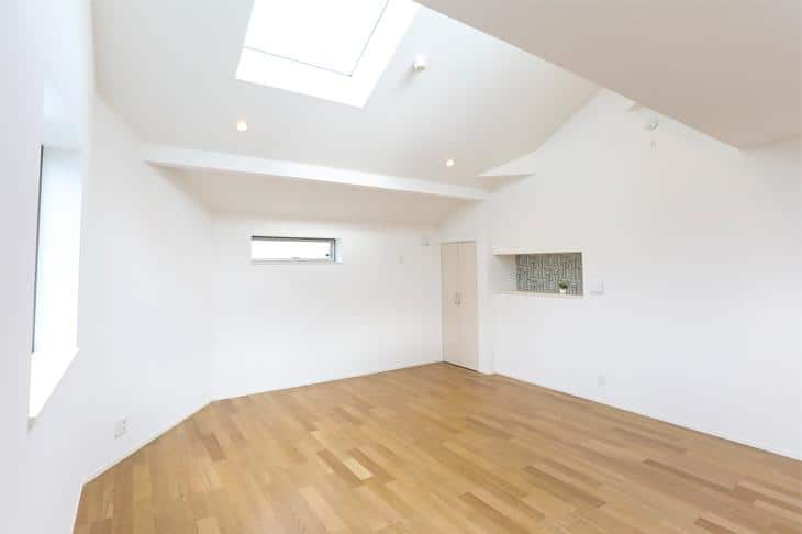 2階は広々としたLDK。勾配天井のある設計で、深呼吸したくなるような開放的な空間をつくり出しています。リビングの一角にはニッチスペースとクローゼットを設置。家具を極力置かない、スッキリとしたLDK空間を実現します。