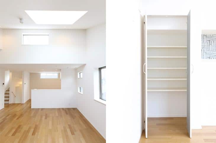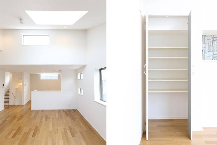 リビングとキッチン上方の横型の窓が、さらに奥行き感を演出。ルーフバルコニーから、リビング上部の窓を通して中の様子を見ることができます。リビングに設えたクローゼットには、本やおもちゃ、掃除用具などをスッキリと収納。