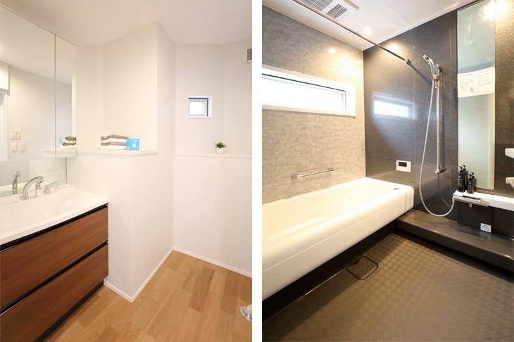 グレーのボタニカル柄のアクセントパネルが印象的なバスルーム。曲線が美しいトクラスのバスタブは、ゆったりと足を伸ばせる広さ。洗面スペースには、ランドリーバスケットや着替えを置ける、使い勝手の良い棚を備え付けました。