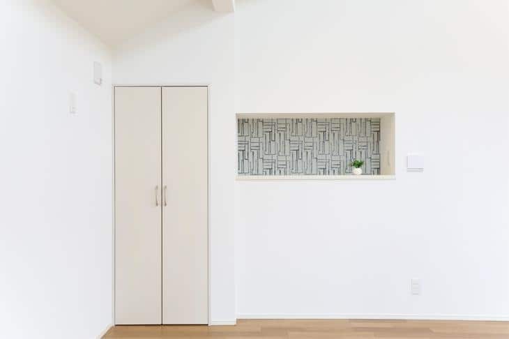 モダンなクロスを貼ったニッチスペースは、LDKの中のフォトジェニックな一角。お気に入りの雑貨や本、植物を飾ったり、間接照明を置いたり。インテリアをセンスよく、自分らしく演出できます。