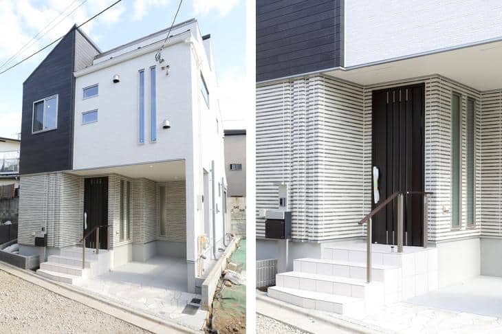ホワイトの外壁に映える、ウッド調のブラックのサイディング。エントランス空間を引き締める、ブラックの玄関ドア。ツートンのコントラストを活かした外観が、立地にふさわしいアーバンモダンな雰囲気を醸し出しています。