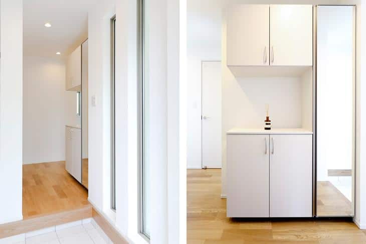 2つの縦スリット窓が明るく迎えてくれる玄関ホール。シューズクローゼットの中央には、花を生けたり、小物を置いたりできるスペースを確保しました。扉が全面鏡の収納は、お出かけ前の身だしなみチェックに便利です。