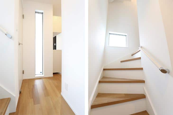 玄関からつながる廊下にも、縦型のスリット窓を。縦長のデザインを連続して配置することで、上下に開放感のある廊下を演出しています。2階に続く階段にも窓を取り入れることで、明るくゆったりとした印象に。