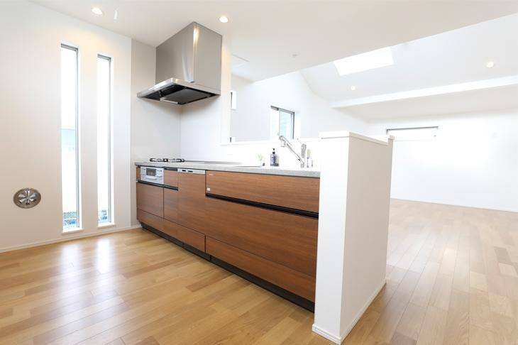 幅255cmのワイドな対面型キッチンは、タカラスタンダード。木目が美しいパネルが、グレード感のあるキッチンを演出します。前後左右にゆとりのあるキッチンは、家族やゲストとともに調理を楽しみたいという方にぴったりです。