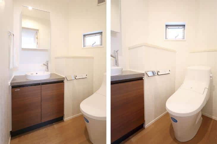 2階のトイレは、鏡付きの手洗いスペースを備えた贅沢な空間。住む人はもちろん、ゲストにも気持ちよく使ってもらえます。ボタニカル柄の壁紙や、小さくてかわいらしい窓も心地よさを演出するポイントです。