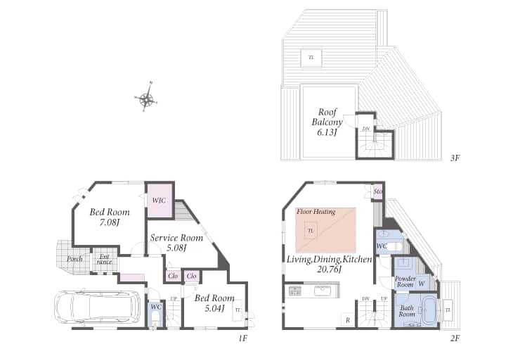 屋上には、6.13畳のルーフバルコニーを設計。洗濯物を干すスペースとしてはもちろん、テーブルや椅子を置いて、もう1つのリビングのような使い方も可能。第一種低層住居専用地域だからこその眺めの良い景色を楽しめます。