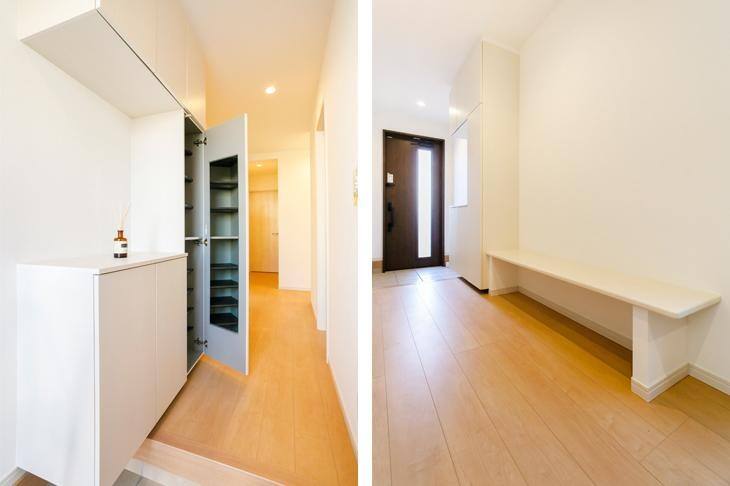 明るく、開放感のある玄関ホール。上下に戸棚のあるシューズクローゼットと扉の内側に鏡を付けたクローク収納を設けました。玄関ホールから続く廊下にしつらえたオシャレなベンチは、この家のシンボルです。