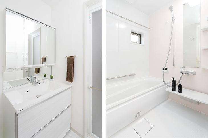 ホワイトでコーディネートした清潔感のある水まわり。パナソニックの洗面化粧台は3面鏡の戸棚付きで収納力も十分です。バスルームはTOTOを採用。浴室には小窓と浴室乾燥機を装備しているので湿気対策もバッチリ。