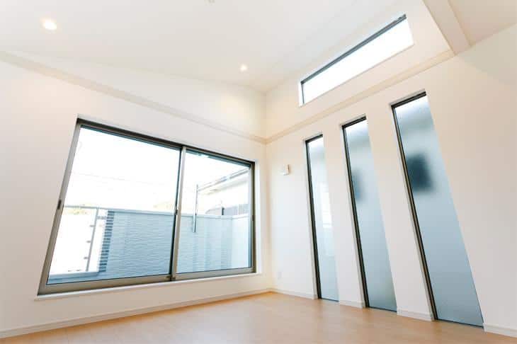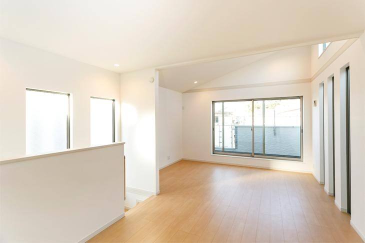リビングの窓はこの家の顔。掃き出し窓と4つのスリット窓、階段上のFIX窓から、やわらかな陽射しが差し込みます。バルコニーの向こうには、第1種低層住宅専用地域ならではの大きな空が広がっています。