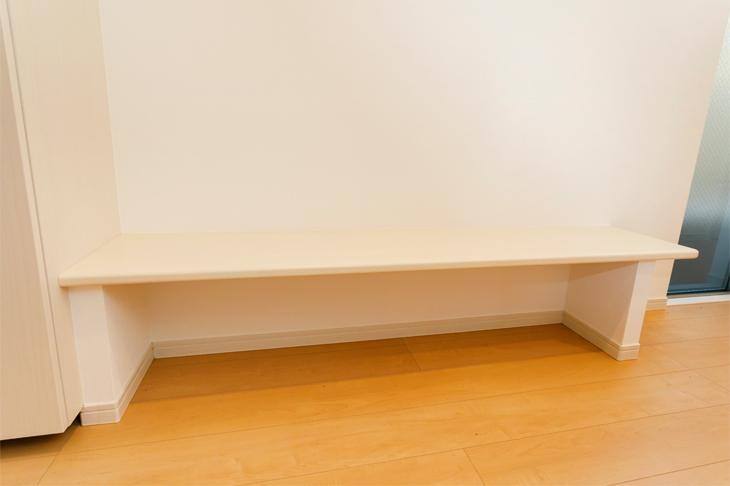 玄関ホールに入ると目に飛び込んでくるオシャレなベンチ。帰宅したときの荷物置きに。クッションや植物、お気に入りの雑貨などをディスプレイするコーナーとしても活用できます。