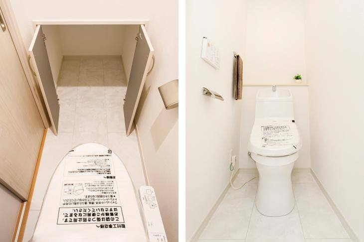 1階は居室の隣、2階は主寝室の横にトイレを設けました。1階のトイレには奥行きのある収納スペースを確保。掃除用具やストック類など、たっぷり収納できます。ゲストも利用する2階のトイレはシンプルに。