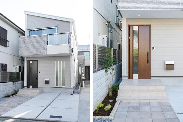 外壁はどこかカントリーな雰囲気を漂わせる木目調のサイディング。バルコニーにポイント使いした濃いグレーと家を縁取る白枠が外観を引き締めています。アプローチに敷いたタイルが訪れる人をあたたかく迎え入れて。