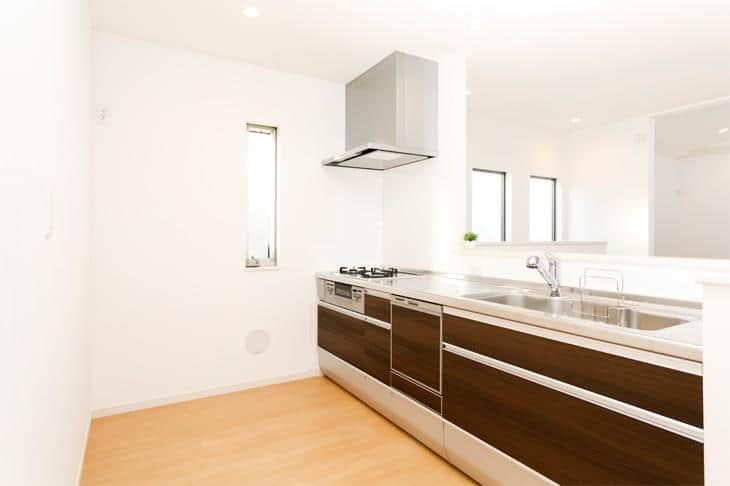 家族がくつろぐ姿を見ながら料理を楽しめる対面式キッチン。クリナップの「クリンレディ」は、ワークトップがステンレスなのでお掃除がラク。深いブラウンの扉カラーはLDKのアクセントになっています。