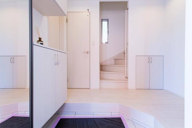 L字型に広がる、開放感あふれる玄関ホール。上下に戸棚のあるシューズクローゼットに加え、大きな姿見の付いたクロークを備えています。階段下の両開き収納は、スポーツ用品やスーツケースの収納にぴったりです。