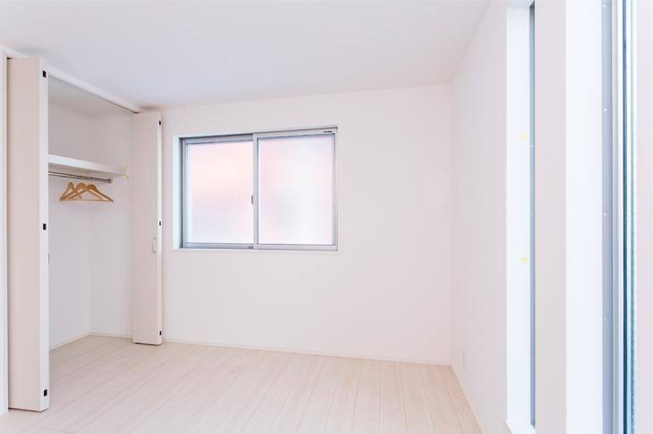 6.19畳のベッドルームは、ベッドやデスクを置いても広々。縦に並んだ2つのFIX窓と引き違い窓から明るい光が差し込みます。大きなクローゼットも備えているので、子どもが大きくなっても収納力は十分。