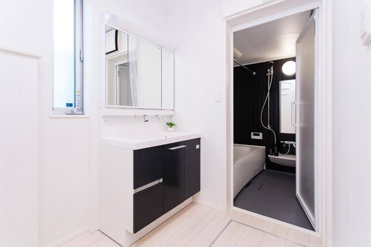 家全体の床材や建具はホワイトでトータルコーディネート。その中でも1階の水まわりには、バスルームの壁面にブラック、洗面化粧台の面材にディープグレーを採用し、大人っぽく仕上げました。ご主人も大満足のバスルームです。