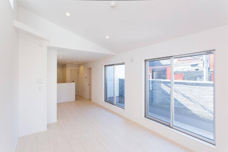 リビングの2つの縦型FIX窓は1階ベッドルームの窓とシンクロする位置に設計。4つの窓が外観にリズムを生み出しています。バルコニーへと続く2つの大きな掃き出し窓から、リビングにたっぷり光と風を取り込めます。