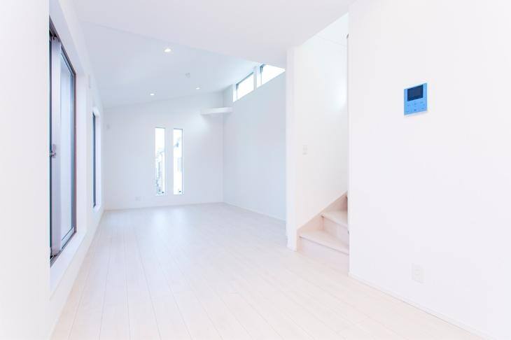 白い外壁に北側の側面にはブルーグレー、2階のバルコニーにはチャコールグレーをコーディネート。シンプルな中にもモダンなテイストが薫る外観です。角地なのでアプローチもゆったりと確保でき、車の駐車もラクラク。