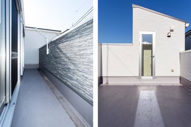 1つはLDKの片側に設けたバルコニー。長方形の敷地だから可能になった、ゆとりの広さと長さです。もう1つは屋上に広がる6.26畳の大きなバルコニー。春・秋はガーデニングやテーブル&チェアを置いてカフェ風に。夏はプール遊びやバーベキューなど、四季を通じて、家族みんなで楽しめます。