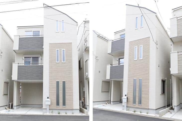 白い外壁とベージュのサイディングが放つやさしい雰囲気を、グレーで引き締めたナチュラルモダンな外観。各階に設けられた、縦型窓の伸びやかな表情もアクセント。白玉の砂利が美しい植栽スペースもポイントです。