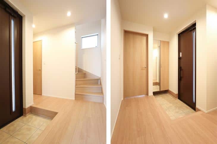 家族やゲストをゆったりと迎え入れる、明るく、広々としたL字型玄関ホール。小さなお子様とのお出かけ時や、慌ただしい夕方の帰宅時もスムーズに。鏡の扉のシューズクローゼットもスッキリと玄関に収まっています。
