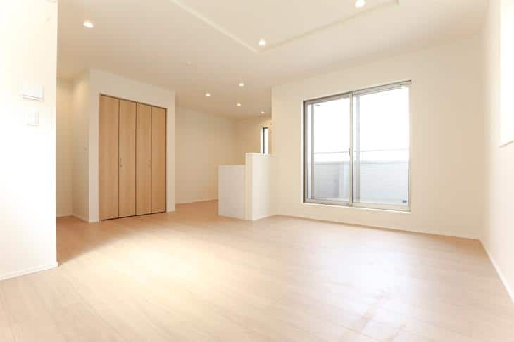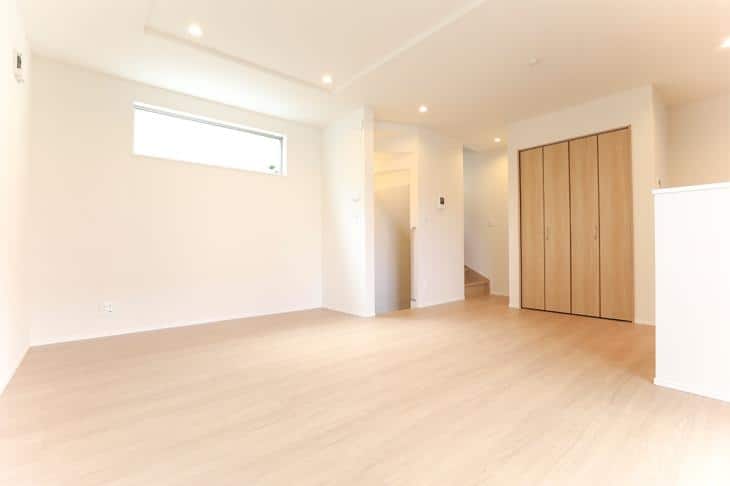 3方に窓のある、明るくて風が抜けるリビング・ダイニング。家族が集まって、羽を伸ばせる気持ちのいい空間です。明るめのオーク色の床材と白い壁紙の組み合わせが、清清しい雰囲気を演出しています。