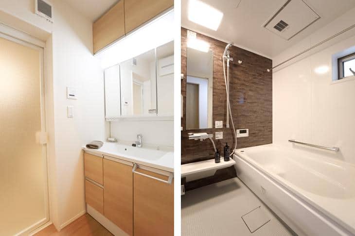 シャワー水栓が付いた洗面台はパナソニック。上部、下部、そして3面鏡裏と、収納たっぷりです。小窓がある落ち着いた雰囲気の浴室はTOTO。半身浴もできるバスタブで疲れをリセットできます。