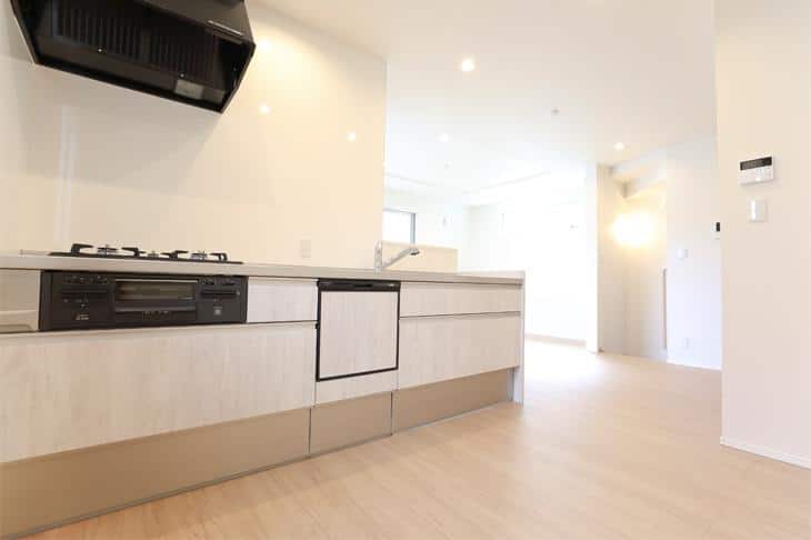 シャビーなペイント風の面材が印象的なキッチンは、パナソニック。ステンレスのワークトップとともにLDKにモダンな印象を与えています。背面に食器棚や冷蔵庫を置いても作業スペースをたっぷり確保できる、奥行きのある間取りも高ポイント。