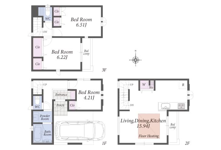 2階のキッチン横の扉の奥は、洗濯機が置けるランドリーコーナー。料理をしながら洗濯ができ、バルコニーへもスムーズに運べます。また、3階の寝室には、高さを活かした大容量クローゼットを設計。上部の棚やハンガーバーなど、使い勝手にも配慮しました。