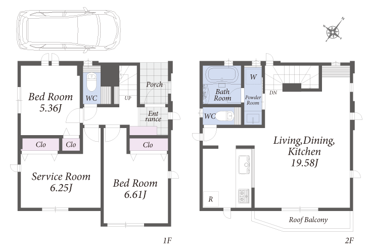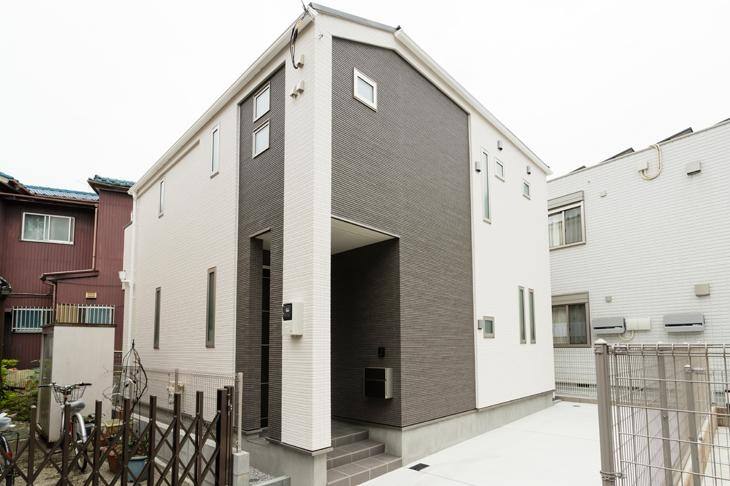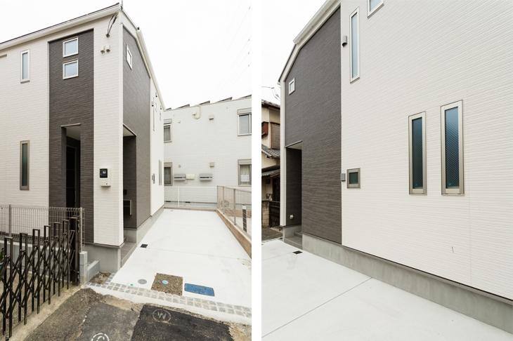 キューブ型に近いデザインが印象的な外観。白とグレーの色づかいや、リズミカルに配置された窓の設計と相まって、モダンな雰囲気を醸し出しています。広々とした駐車場スペースから玄関へのアプローチもスムーズです。