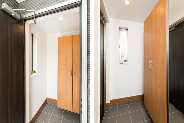 縦型の窓が付いた明るい玄関ホールは、グレーのタイルで落ち着いた印象に。シューズクローゼットの横にはベビーカーやゴルフバッグ、スーツケースなどを置いておける、使い勝手の良いスペースを設けました。