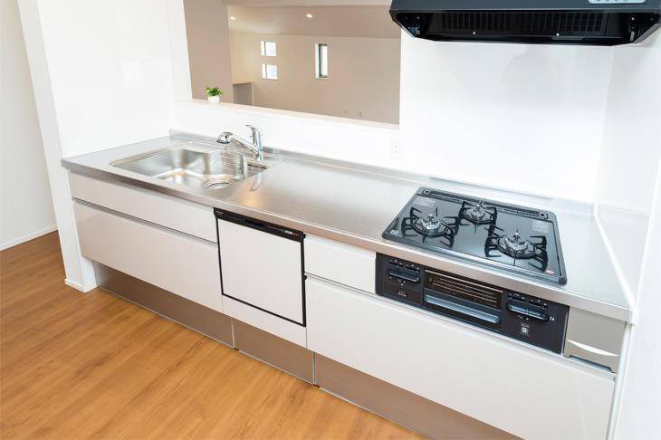 シンプルで飽きのこないデザインの対面式キッチンは、パナソニック。LD空間に対して、キッチンはセミオープンに。家族やゲストとのコミュニケーションのしやすさを損なうことなく、煩雑になりがちなキッチンをほどよく目隠しできます。