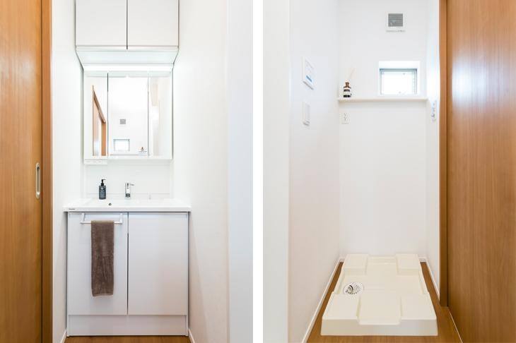 上下にたっぷりと収納がある洗面台は、パナソニック。ランドリースペースには、風が抜ける小窓が付いています。洗剤を置いたり、お気に入りの雑貨を飾ったりするのにちょうど良い、飾り棚も備え付けました。