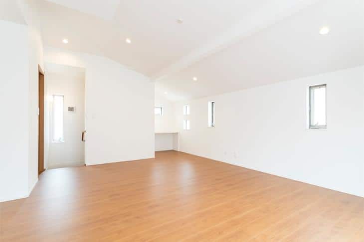 階段を上がると、家族が集うLDKへ。LDの大空間には、ソファやテレビ台、ダイニングテーブルなどをコーディネートする楽しみも広がっています。あちこちに設計された窓の表情もLDKのアクセントです。