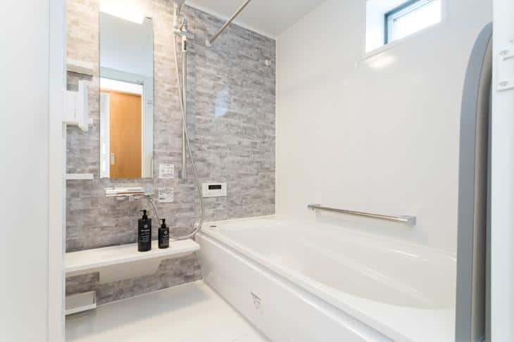 バスルームは、TOTOを採用。落ち着きのあるタイル模様のパネルがアクセントです。白とグレーのシンプルな組み合わせで、センスの良いモダンなリラックス空間に。換気に配慮した、小窓もうれしいポイントです。