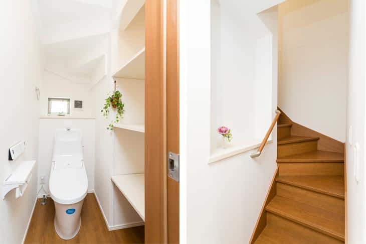 階段下のスペースを活用したトイレには、ビッグサイズの収納棚を備え付けました。トイレットペーパーなどのストック品もたっぷりと収められます。また、階段横にはニッチスペースを。ゲストをもてなす装飾はもちろん、カギや印鑑などの置き場としても便利です。