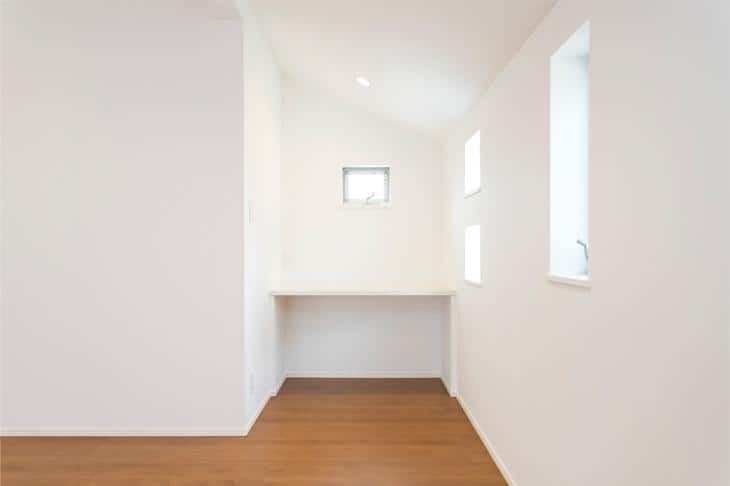 2階のLDKには、凹凸を活用したワークスペースを設計。家族共用のパソコンを置いて書斎スペースに。アイロンがけなどを行う家事スペースや子どもの勉強コーナーにするなど、家族のライフスタイルに合わせて便利に使えます。