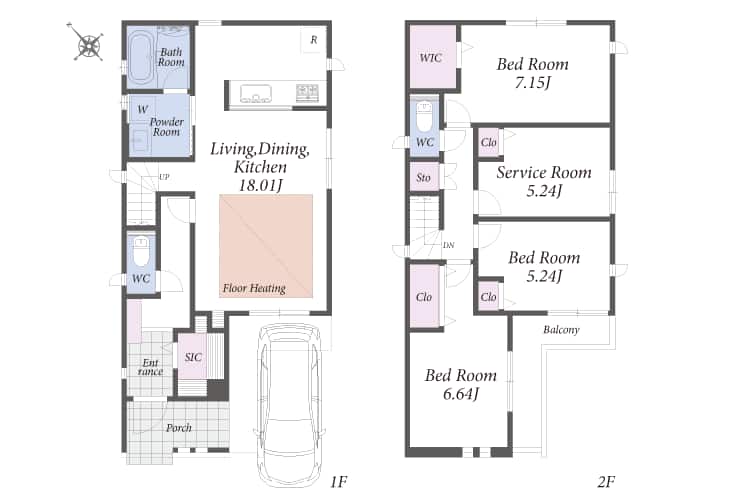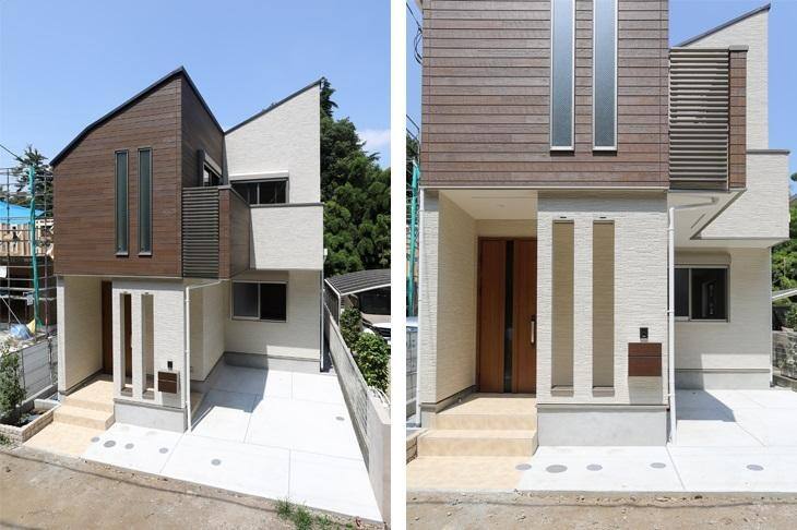 オフホワイトとウッディーな濃いブラウンの組み合わせが落ち着きを与える外観。どの年代のご家族にもマッチする、ナチュラルかつシンプルな佇まいです。玄関へのアプローチは2つあり、正面と駐車スペースの双方から出入りできます。