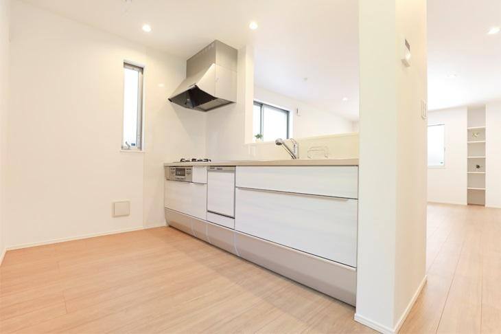 食洗器も付いた対面式のキッチンは、クリナップ。白いLDKに合わせたペアウッドホワイトが、キッチンをより明るく見せてくれます。リビングの隅々まで見渡せるので、小さなお子様がいる家族も安心。