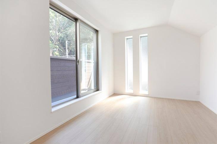 2階にある主寝室は6.64畳。落ち着いたフォルムの勾配天井が心地良い眠りへといざなってくれます。バルコニー側の大きな掃き出し窓と2つの縦型窓から、明るい光が入るので、朝も気持ちよく目覚められそう。