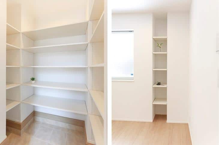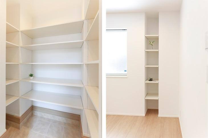買い物から帰ってきたら、そのまま物を収納できるクローゼットが玄関に。食品や消耗品などのストックや防災グッズ置き場として。スペースに余裕があるので、スーツケースやアウトドア用品なども収納できます。リビングのニッチ棚は、飾り棚としてはもちろん、CDや洋書など、「見せる」収納棚としても活躍しそう。