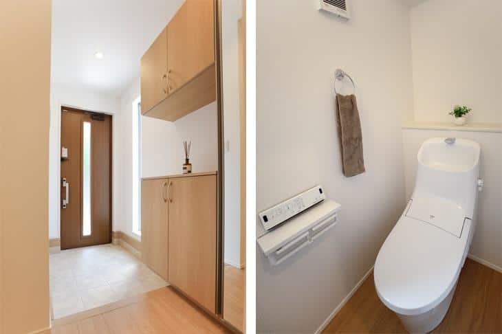スリット窓から光が入る明るい玄関ホールには、収納力にすぐれたコの字型シューズクローゼットを設計。廊下の左側にはトイレを設けました。ストライプの壁紙を採用し、スタイリッシュかつ清潔感あふれる空間に。飾り棚は、グリーンやアロマ置きのスペースとしても活用できそうです。