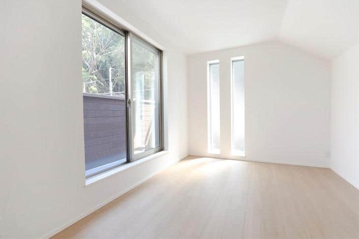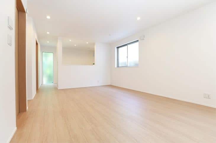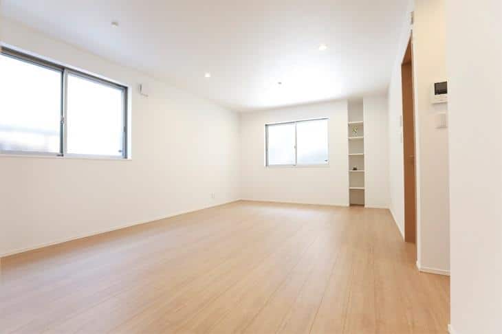 窓は、東南と西南にあり、採光も十分。窓が大きすぎないため、家具も好みに合わせてレイアウトできます。玄関側の壁にある、埋め込み型の細長ニッチ棚もリビングのアクセントに。