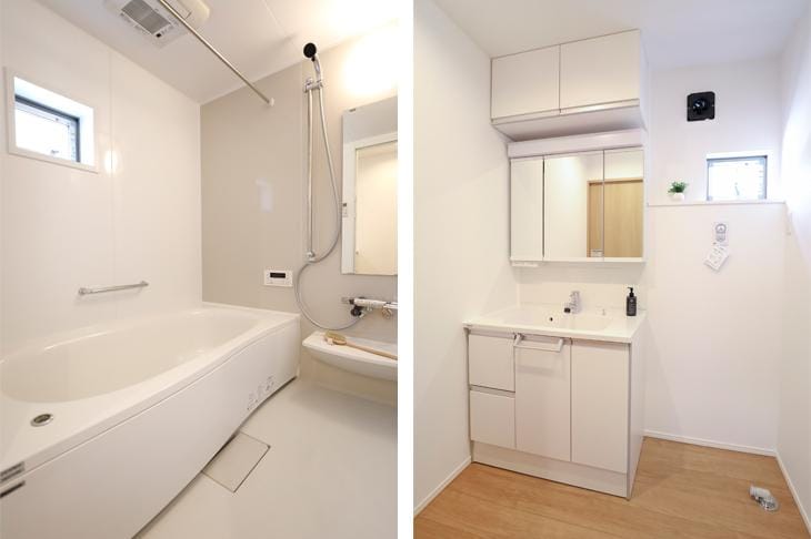 キッチン横にある洗面台とバスルームは、どちらもパナソニック。家族が集うLDKに隣接しているので、気温差を気にすることなく、快適に利用できます。ランドリースペース、バスルームに小窓を付けることで換気力を高めました。