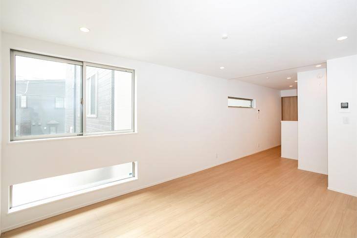 LDKは2階に。階段の左右に、LDとキッチンが振り分けられており、動線もスムーズです。リビングには南東・南西の窓から光と風が入り、明るさも十分。シンプルで無駄のない空間なので、ダイニングテーブルやオーディオボード、ソファなどを、生活スタイルに合わせてレイアウトできます。
