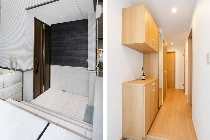 高級感のある重厚な玄関ドアと色を合わせた、カーボンブラックのサイディングがアクセント。都心の家ならではの洗練された印象のエントランスです。シューズクローゼットは、鏡面タイプとセパレートタイプの2つが設置されているので、収納力も十分です。