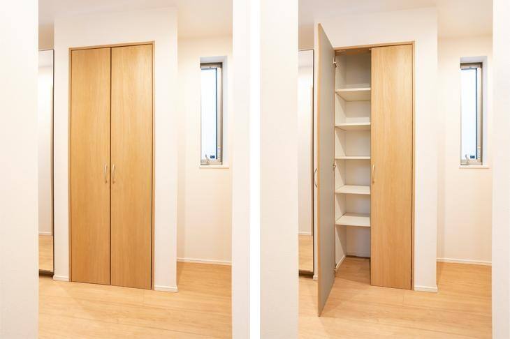 シューズクローゼットの隣に、もう1つ収納棚を設けました。ストック品やスポーツ用品、小型のキャリーバッグなど、家族共有のクローゼットとして重宝しそうです。また、廊下にある縦長の小窓から明るさと風を取り入れるなど、細やかな設計の工夫が光ります。