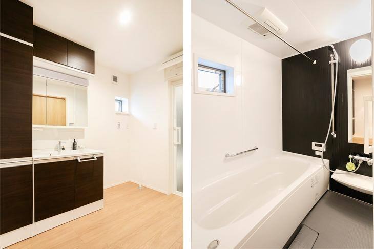 洗面台とバスルームはいずれもパナソニック。白にブラックが映え、シックで落ち着きのある印象を与えてくれます。収納力にすぐれた洗面台の鏡面扉を開けると、左右にコンセントが2つ。家族が同時に利用できる利便性と、パウダールーム全体の余裕のある広さもポイントです。