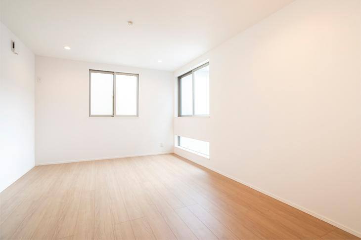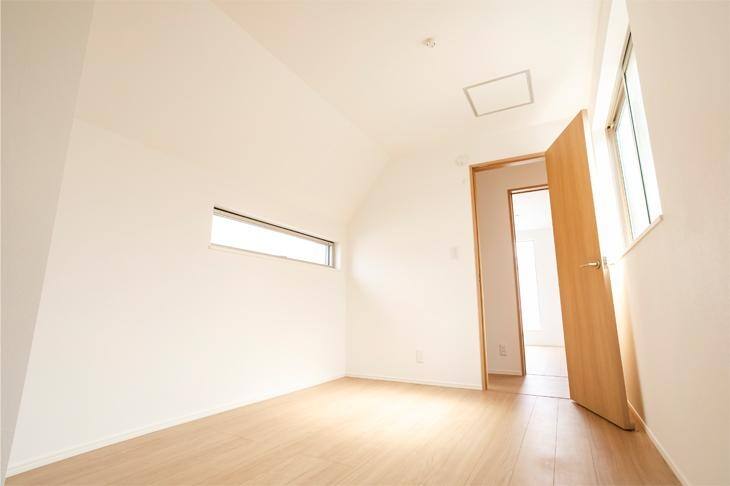 3階奥にある5.64畳の寝室。勾配天井の角度を利用したスタイリッシュなデザインと横長の窓が印象的です。3階の2つの寝室は、階段ホールの左右に振り分けられているので、プライバシーも守られます。